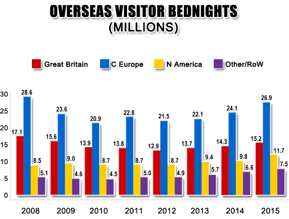 Holiday visitors accounted for an increasing share of bednights in 2015, up two percentage points to 42%, with VFR accounting for 28%, business 13% and those visiting for ‘other reasons’ 17%.