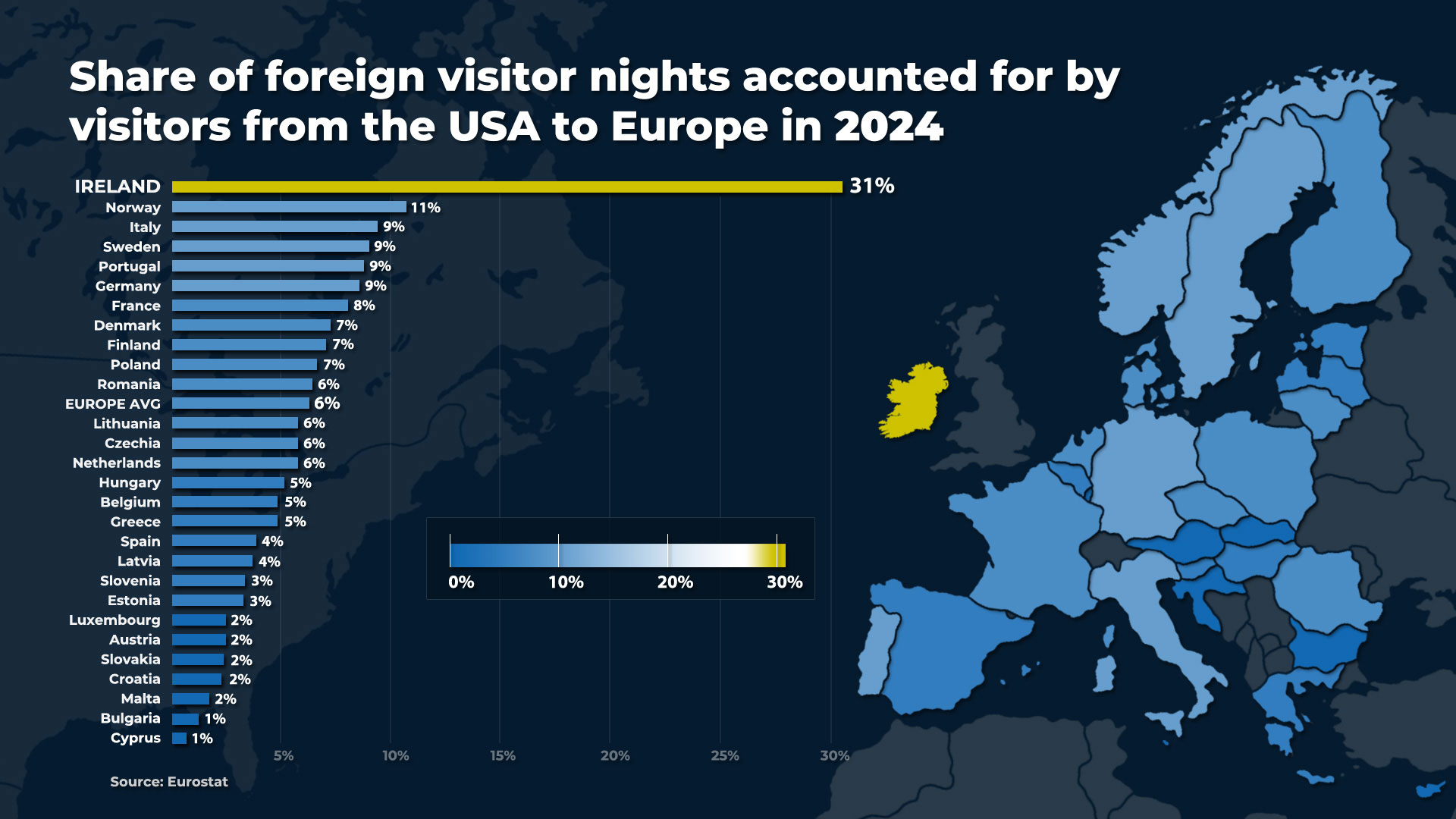 The chart presents data for 2024 and it is readily apparent that Ireland is an outlier, with 31% of foreign visitor nights in tourist accommodation attributable to those from the US, far ahead of Norway in second spot on 11% and Italy in third place on 9%, with the EU average being 6%.