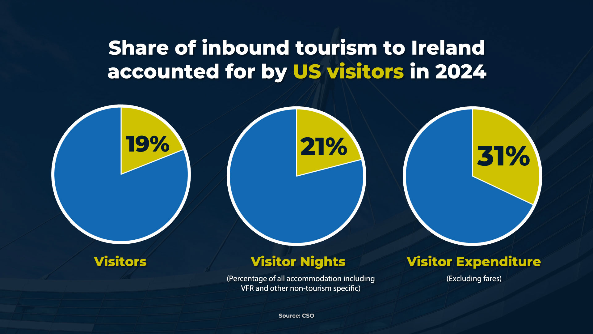 Last year Ireland welcomed more than 1.2 million American visitors who spent 10.5 million nights in the country and contributed €1.9 billion (excluding airfares) to the Irish economy. Signs are pointing to further growth in 2025, with latest CSO statistics indicating a 4% year-on-year uptick in visits from the USA for the first nine months of the year.