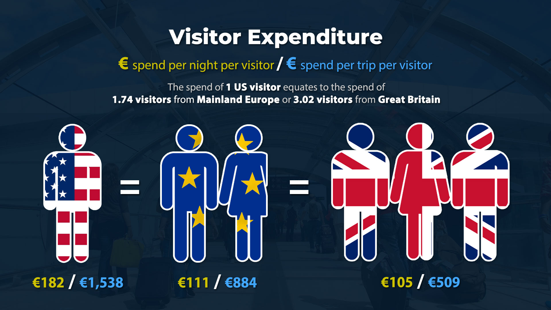 Meanwhile visitors to Ireland from Great Britain spend on average €105 per night and €509 per visit, and those from Europe typically spend €111 per night and €884 per visit. Contrast these figures with the equivalent metrics for the US market, with Americans spending an average of €182 per night and €1,538 per visit. Put another way, an American visitor stepping foot in Ireland is worth the same as 1.74 European visitors or 3.02 visitors from Great Britain.