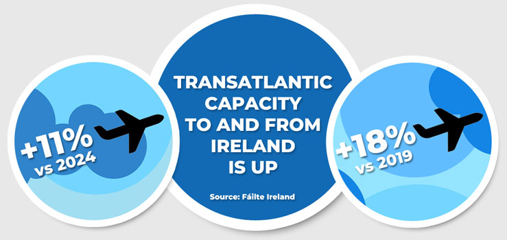 Fáilte Ireland analysis suggests that seat capacity from North America to Ireland has been one of the fastest growing segments in recent times, increasing by 11% in the past year, and this summer it accounts for 13% of all air seats to/from Ireland (the bulk of which are from the USA as opposed to Canada). There are five airlines operating a remarkable 25 routes between North America and Ireland.