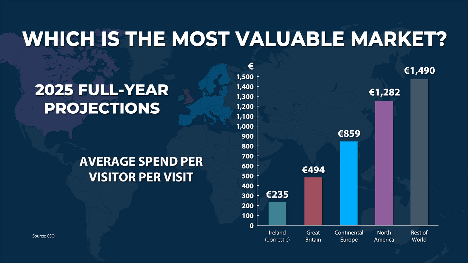 When looking at 2025 projections for volume and value, as well as spend per visit based on broad country group, some interesting insights are revealed. The North American market is the most valuable to the Irish tourism economy amounting to €1.933 billion in 2025 (excluding fares) with the individual North American tourist spending €1,282 per visit. Continental Europeans spent a total of €1.726 billion or €859 per visitor while the British market was valued at €1.61 billion with the average Briton spending €494 per visit. Meanwhile other markets contributed €445 million to the Irish tourism economy in 2025.
